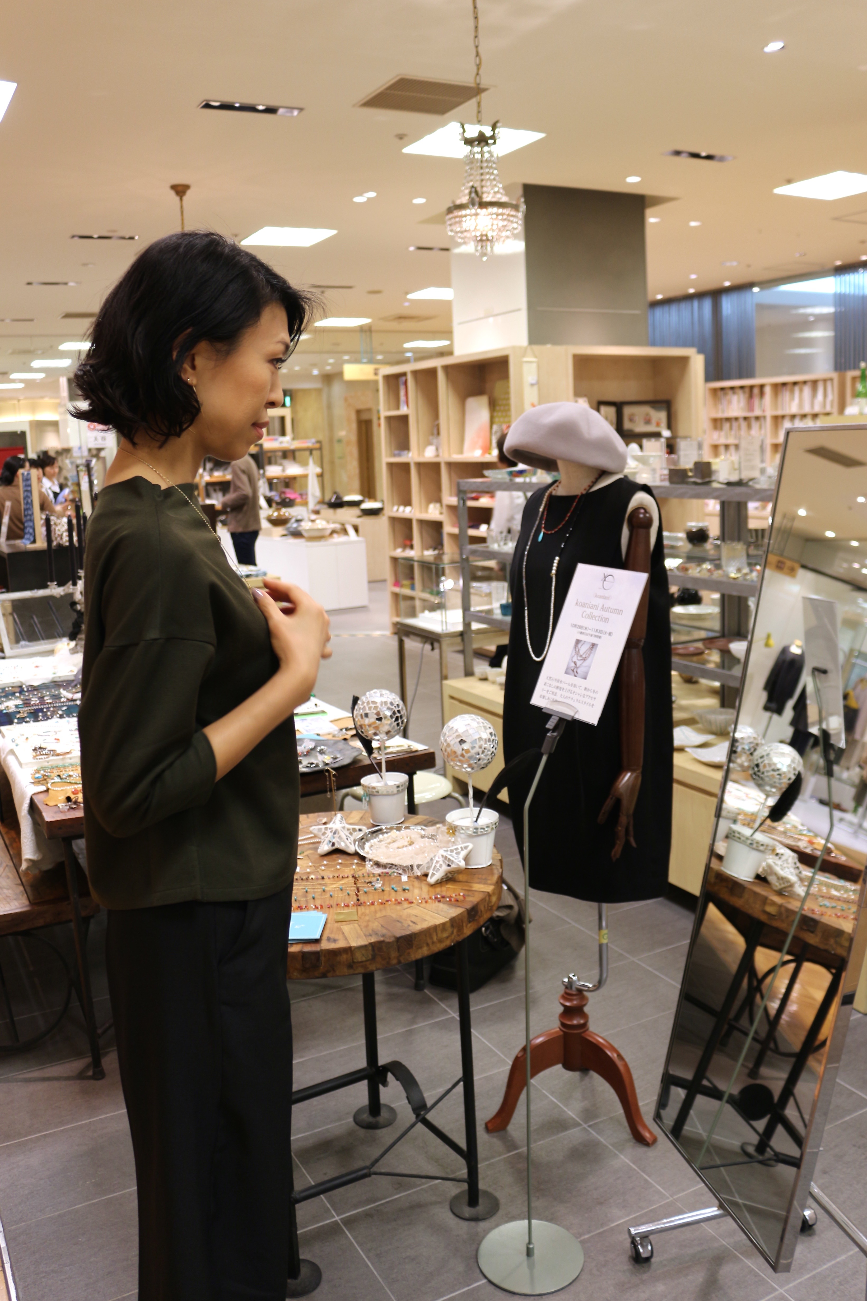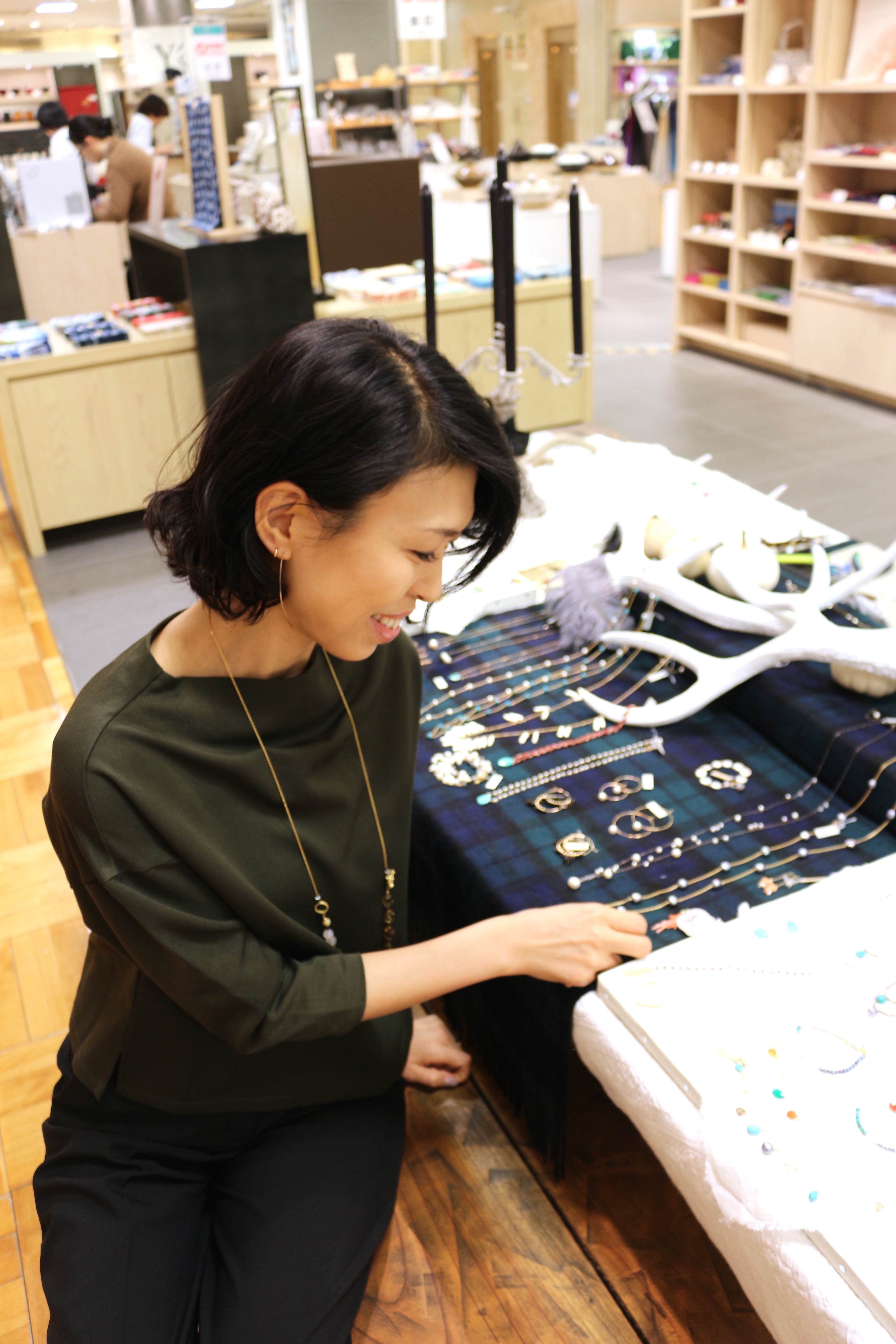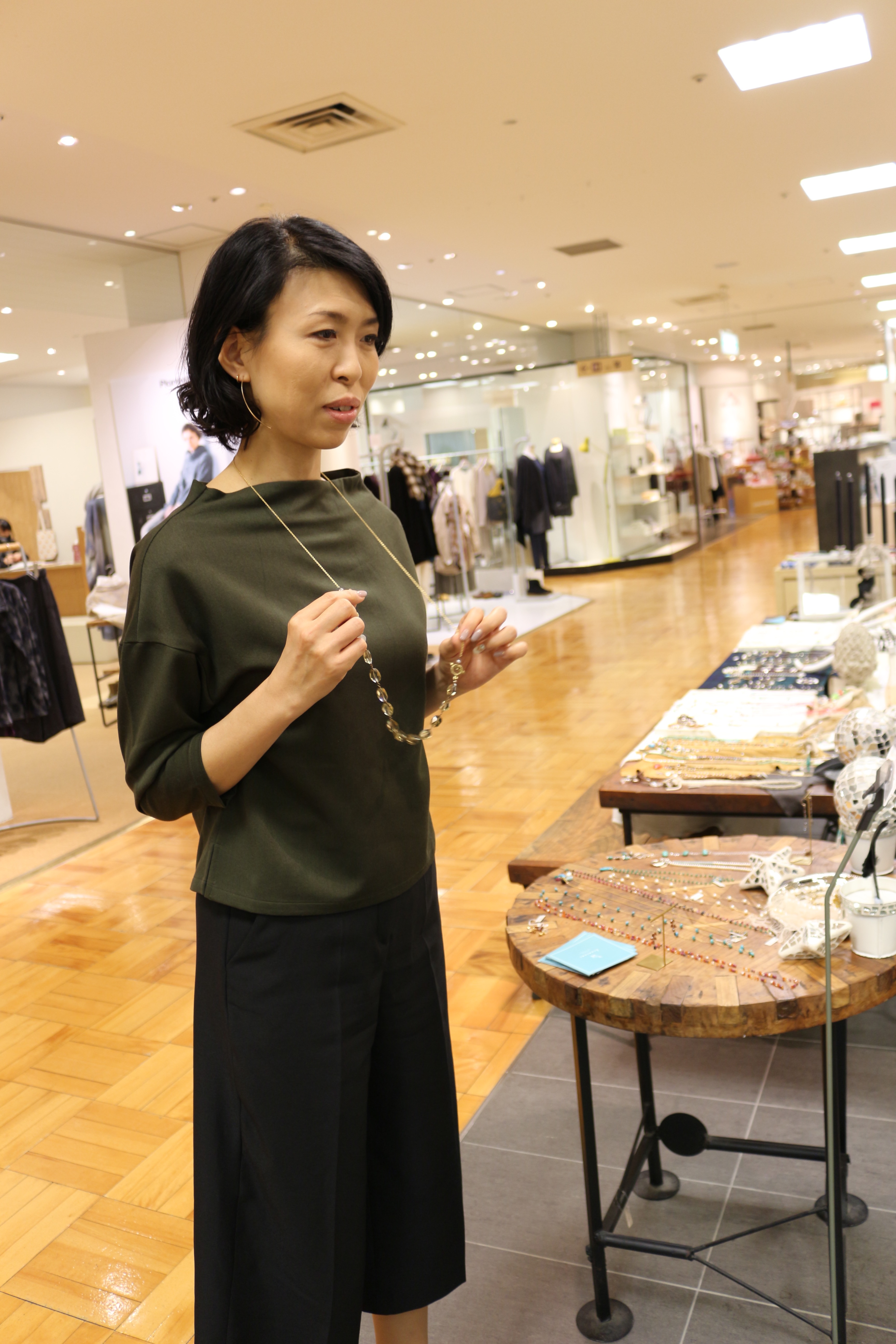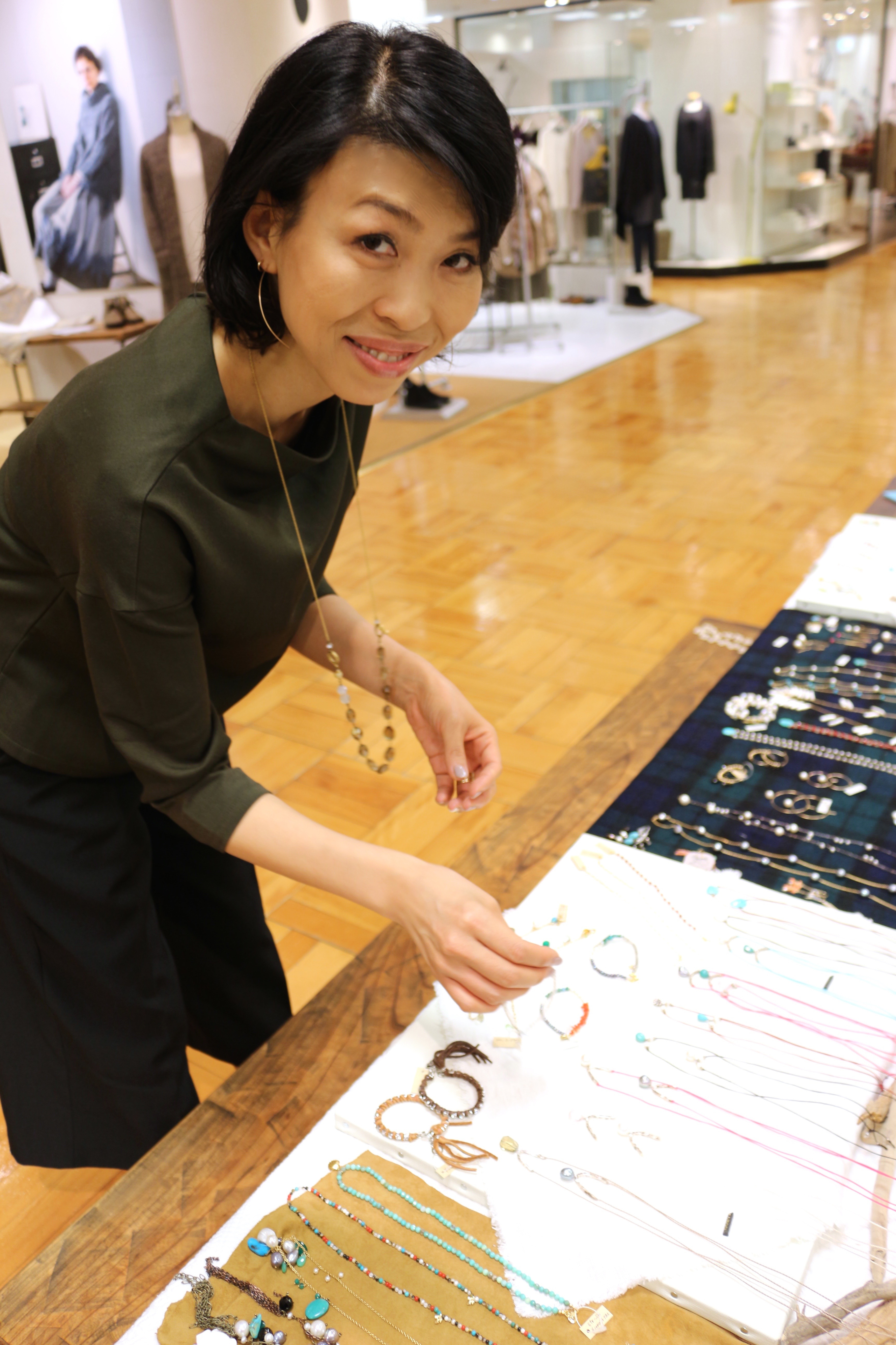 カーキ色のトップスに透明なクウォーツがとても良く会っていました。